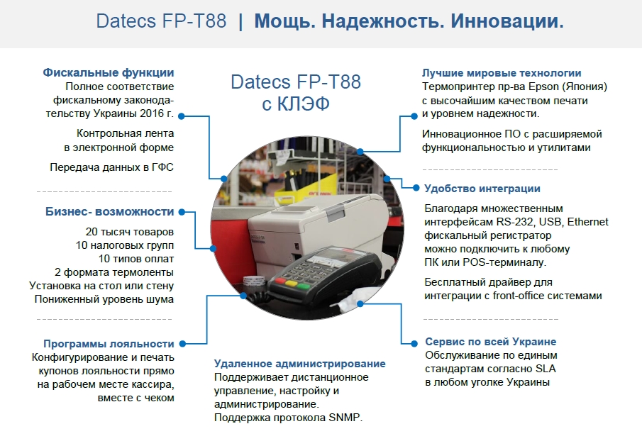 Datecs FP-T88 - единственный в Украине фискальный регистратор, поддерживающий работу в терминальном режиме. Использование терминальных решений позволяет IT-департаменту сократить затраты и повысить безопасность на рабочих местах кассиров.